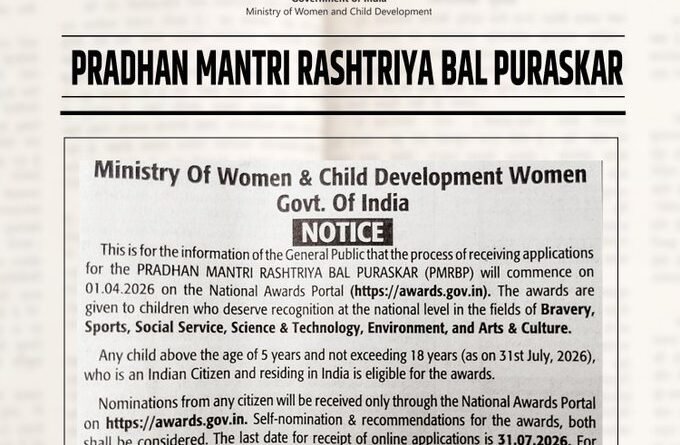 The Government of India has invited nominations for the Pradhan Mantri Rashtriya Bal Puraskar (PMRBP), a prestigious national-level award conferred annually to recognize exceptional achievements of children across the country. The awards are given to children who deserve recognition at the national level in the fields of Bravery, Sports, Social Service, Science & Technology, Environment and Arts & Culture.